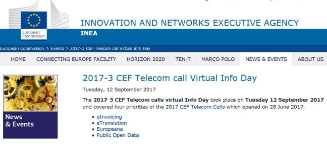 The Connecting Europe Facility (CEF) of the European Commission aims at promoting growth, jobs and competitiveness through targeted infrastructure investment, e.g. in transport, energy and digital services. The latter form part of the CEF Telecom package. Currently, there are open calls in the areas of eInvoicing, eTranslation, Europeana and Open Data Portal. A virtual Info Day was held on 12 September 2017, the below summary is based on the presentations of that Info Day.